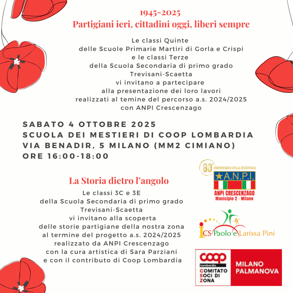 Sabato 4 ottobre dalle 16 alle 18 si terrà la mostra conclusiva del ricco e proficuo lavoro svolto dal Gruppo Scuole di ANPI Crescenzago lo scorso anno scolastico con le classi Quinte della Primaria Crispi e della Primaria Martiri di Gorla e della Secondaria di I grado Trevisani – Scaetta.